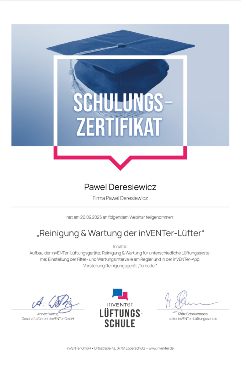 Ich bin als Partnerunternehmen der Inventer GmbH, einem renommierten Hersteller von dezentralen Lüftungssystemen, autorisiert, Wartungs- und Reinigungsarbeiten an Ihren Geräten - fachgerecht durchzuführen.
